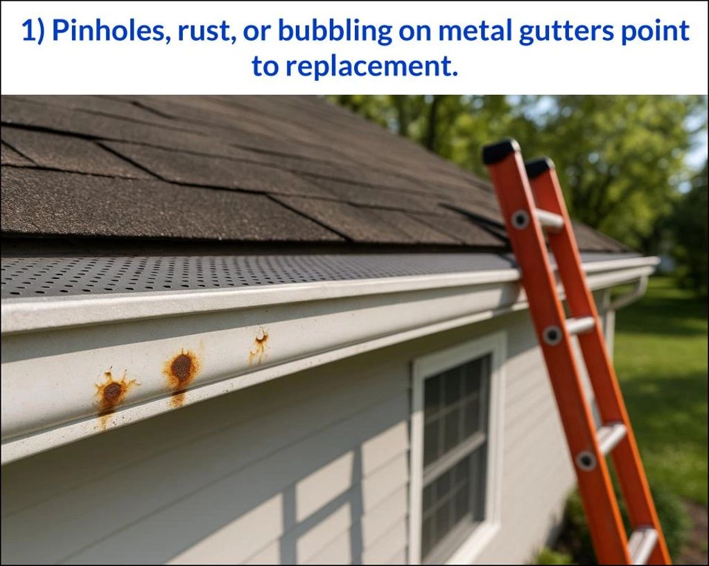 Surface rust and paint blistering indicate the protective coating has failed. Pinhole leaks quickly expand and will stain fascia and siding. If corrosion is widespread, or if sections are thin or pitted, replacement is more effective than patching.