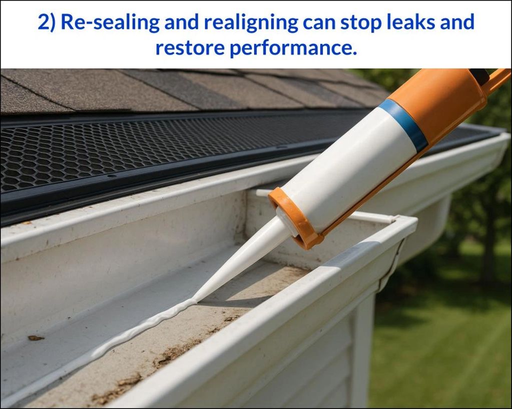 Clean and dry joints before applying gutter sealant; replace worn hangers and adjust pitch to maintain 1/16–1/8 inch per foot toward downspouts. Re-hang sections that hold water (sagging) and re-seal miters, outlets, and end caps. After adjustments, run a hose test to confirm continuous flow.