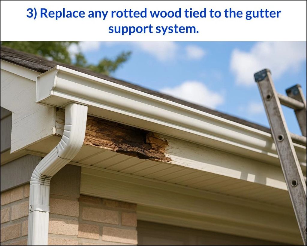 Gutters must fasten to sound framing. Replace rotted fascia, sub-fascia, and soffit so fasteners hold securely. Prime cuts and use corrosion-resistant fasteners. Consider adding a drip edge and proper flashing to protect new wood.