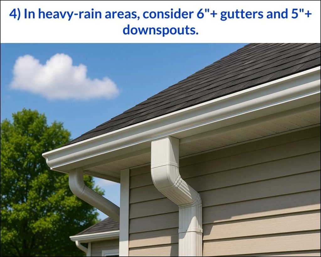 Larger profiles increase capacity and reduce overflow during cloudbursts. Use additional downspouts on long runs and at inside valleys. Confirm underground drainage can handle the added flow to avoid backups.