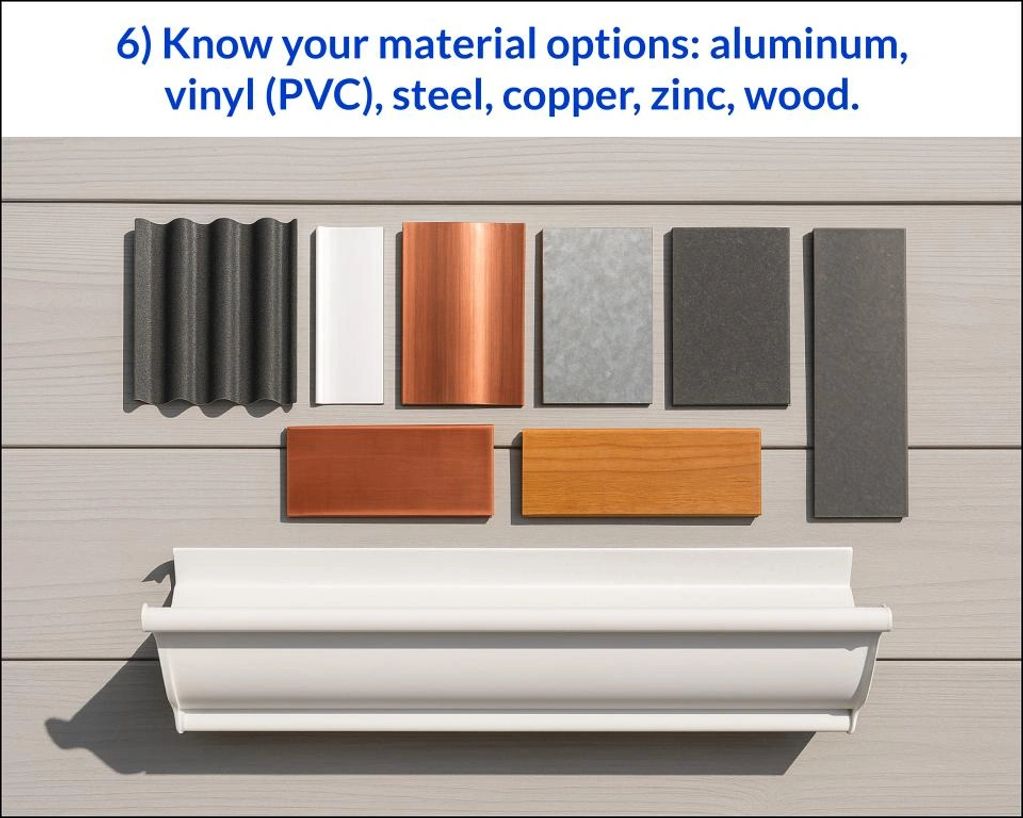 Aluminum: light, corrosion-resistant, widely used. Vinyl: economical, but can become brittle in UV/cold. Steel: strong, heavy; needs quality coatings. Copper: premium aesthetics; patinas naturally. Zinc: durable with self-healing patina. Wood: traditional look; high maintenance.